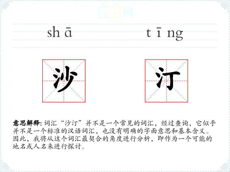 - 人名:如果“沙汀”是一个人名,它可能是一个中文名字,具有特定的文化背景和含义。