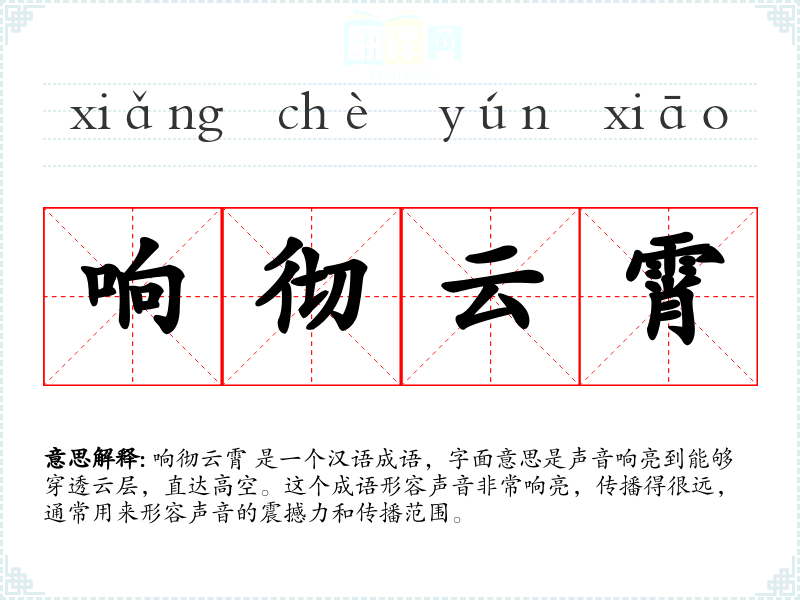 响彻云霄 是一个汉语成语,字面意思是声音响亮到能够穿透云层,直达高空。这个成语形容声音非常响亮,传播得很远,通常用来形容声音的震撼力和传播范围。