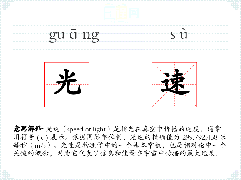 在不同语言中,“光速”通常都有对应的词汇,如英语中的“speed of light”,德语中的“Lichtgeschwindigkeit”,日语中的“光速度”(こうそくど)。这些词汇虽然在语言表达上有所不同,但都指向同一个物理概念。