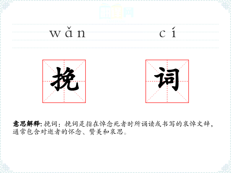 挽词:挽词是指在悼念死者时所诵读或书写的哀悼文辞,通常包含对逝者的怀念、赞美和哀思。