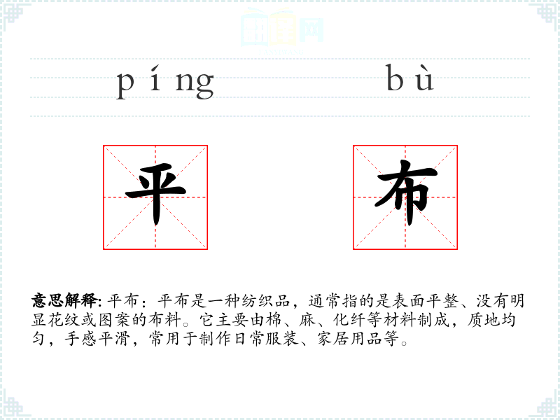 - 反义词:花布、提花布、印花布。这些词汇指的是表面有花纹、图案或特殊处理的布料,与平布形成对比。