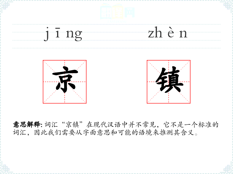 词汇“京镇”在现代汉语中并不常见,它不是一个标准的词汇,因此我们需要从字面意思和可能的语境来推测其含义。