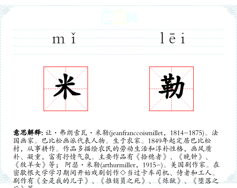 让·弗朗索瓦·米勒(jeanfranccoismillet,1814-1875)。法国画家。巴比松画派代表人物。生于农家。1849年起定居巴比松村,从事耕作。作品多描绘农民的劳动生活和淳朴性格,画风质朴、凝重,富有抒情气氛。主要作品有《拾穗者》、《晚钟》、《牧羊女》等; 阿瑟·米勒(arthurmiller,1915-)。美国剧作家。在密歇根大学学习期间开始戏剧创作◇当过卡车司机、侍者和工人。剧作有《全是我的儿子》、《推销员之死》、《炼狱》、《堕落之后》等。