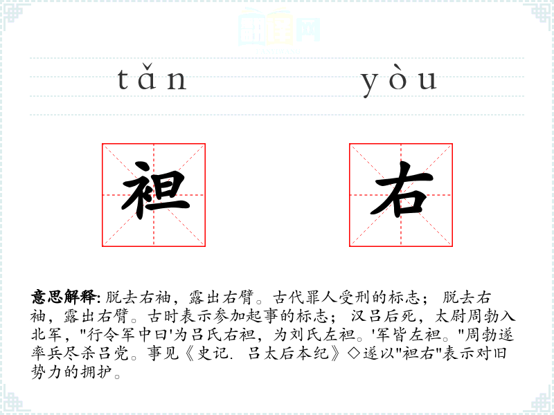 1.脱去右袖,露出右臂。古代罪人受刑的标志; 脱去右袖,露出右臂。古时表示参加起事的标志; 汉吕后死,太尉周勃入北军,"行令军中曰'为吕氏右袒,为刘氏左袒。'军皆左袒。"周勃遂率兵尽杀吕党。事见《史记.吕太后本纪》◇遂以"袒右"表示对旧势力的拥护。