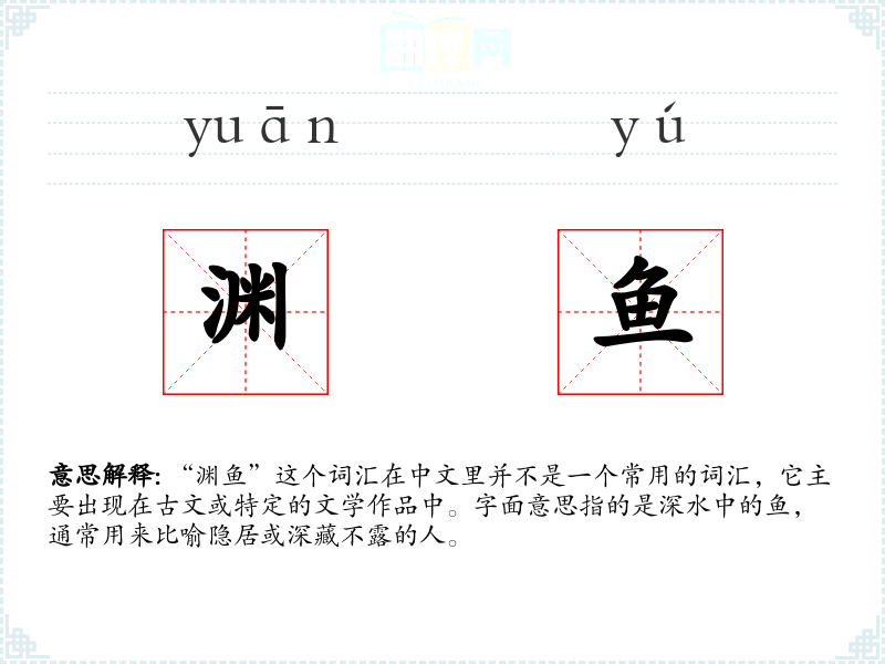 “渊鱼”这个词汇在中文里并不是一个常用的词汇,它主要出现在古文或特定的文学作品中。字面意思指的是深水中的鱼,通常用来比喻隐居或深藏不露的人。