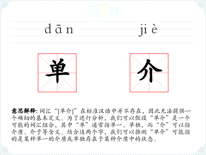 词汇“[单介]”在标准汉语中并不存在,因此无法提供一个确切的基本定义。为了进行分析,我们可以假设“单介”是一个可能的词汇组合,其中“单”通常指单一、单独,而“介”可以指介质、介于等含义。结合这两个字,我们可以推测“单介”可能指的是某种单一的介质或单独存在于某种介质中的状态。