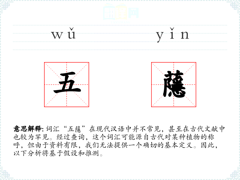 词汇“五蘟”在现代汉语中并不常见,甚至在古代文献中也较为罕见。经过查询,这个词汇可能源自古代对某种植物的称呼,但由于资料有限,我们无法提供一个确切的基本定义。因此,以下分析将基于假设和推测。