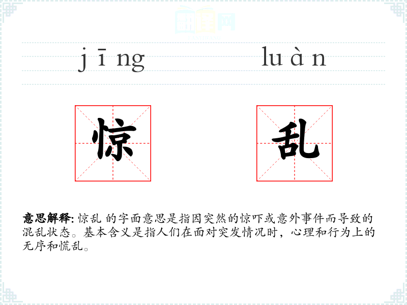 惊乱 的字面意思是指因突然的惊吓或意外**而导致的混乱状态。基本含义是指人们在面对突发情况时,心理和行为上的无序和慌乱。