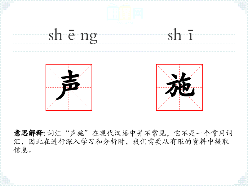 词汇“声施”在现代汉语中并不常见,它不是一个常用词汇,因此在进行深入学*和分析时,我们需要从有限的资料中提取信息。