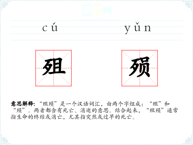 “殂殒”是一个汉语词汇,由两个字组成:“殂”和“殒”。两者都含有死亡、消逝的意思。结合起来,“殂殒”通常指生命的终结或消亡,尤其指突然或过早的死亡。