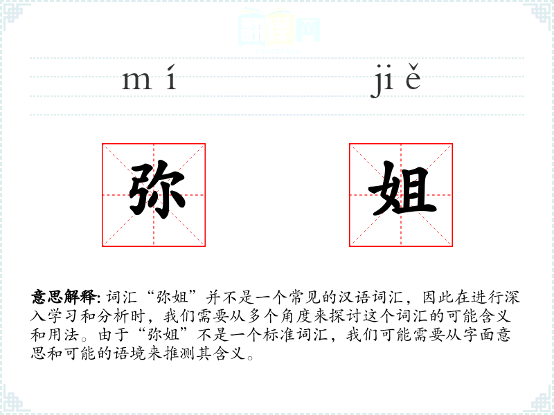 词汇“弥姐”并不是一个常见的汉语词汇,因此在进行深入学习和分析时,我们需要从多个角度来探讨这个词汇的可能含义和用法。由于“弥姐”不是一个标准词汇,我们可能需要从字面意思和可能的语境来推测其含义。