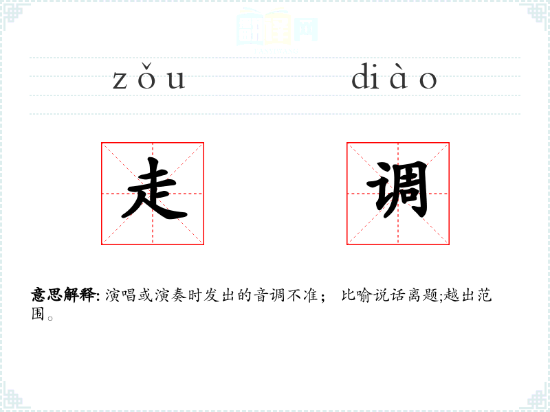演唱或演奏时发出的音调不准; 比喻说话离题;越出范围。