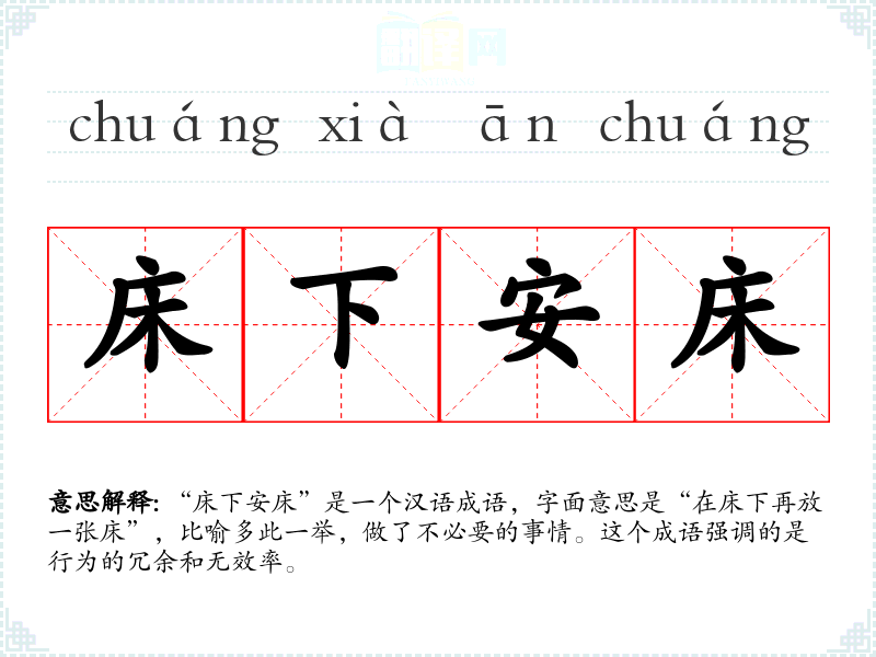 “床下安床”这个成语在汉语中是一个非常有用的表达,它不仅可以帮助我们批评那些不必要的行为,还可以提醒我们在生活和工作中追求效率和简洁。通过学*和使用这个成语,我们可以更好地理解和应用汉语的丰富表达。