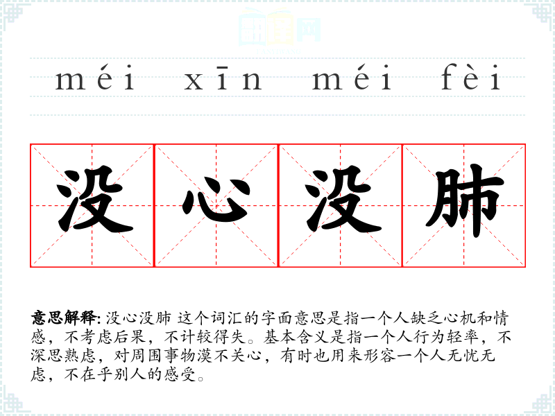没心没肺 这个词汇的字面意思是指一个人缺乏心机和情感,不考虑后果,不计较得失。基本含义是指一个人行为轻率,不深思熟虑,对周围事物漠不关心,有时也用来形容一个人无忧无虑,不在乎别人的感受。