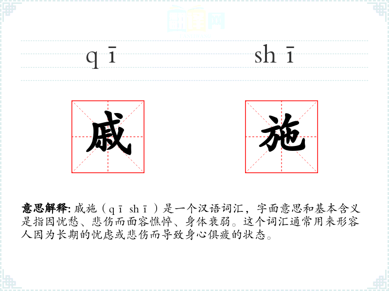 戚施(qī shī)是一个汉语词汇,字面意思和基本含义是指因忧愁、悲伤而面容憔悴、身体衰弱。这个词汇通常用来形容人因为长期的忧虑或悲伤而导致身心俱疲的状态。