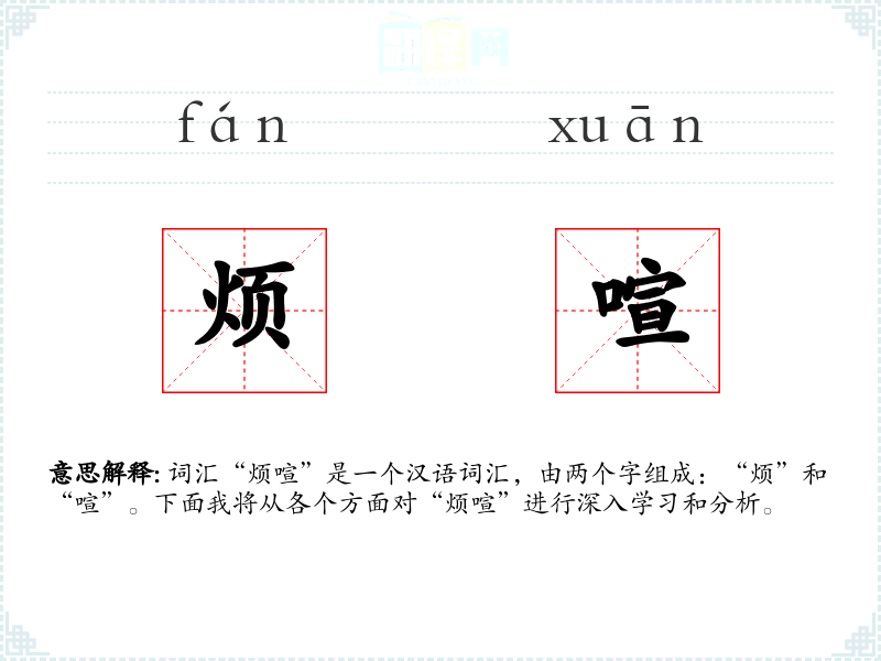 “烦”和“喧”都是古汉语词汇,历史悠久。在古代文献中,如《诗经》、《左传》中已有使用。随着时间的推移,这两个字组合成“烦喧”,用来形容让人感到烦躁的嘈杂声音。