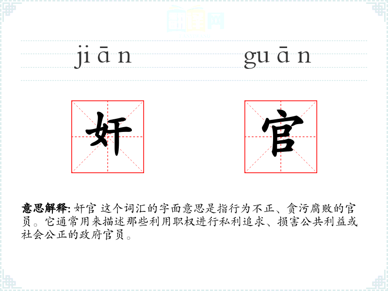 奸官 这个词汇的字面意思是指行为不正、贪污腐败的官员。它通常用来描述那些利用职权进行私利追求、损害公共利益或社会公正的政府官员。