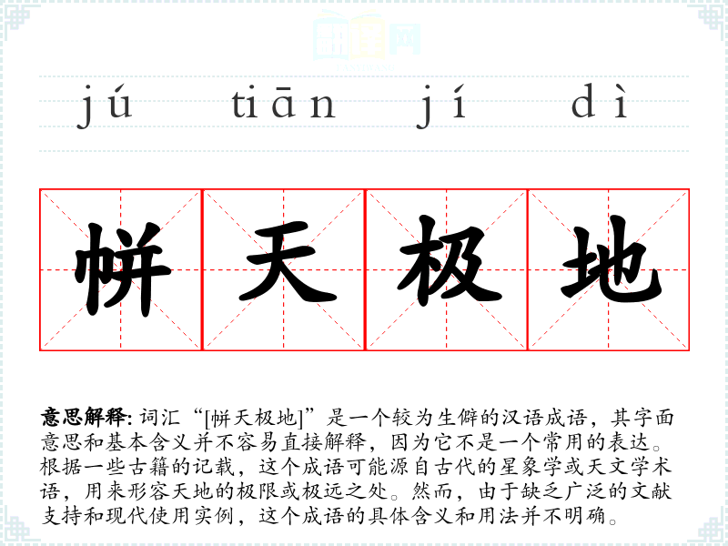 词汇“[帡天极地]”是一个较为生僻的汉语成语,其字面意思和基本含义并不容易直接解释,因为它不是一个常用的表达。根据一些古籍的记载,这个成语可能源自古代的星象学或天文学术语,用来形容天地的极限或极远之处。然而,由于缺乏广泛的文献支持和现代使用实例,这个成语的具体含义和用法并不明确。