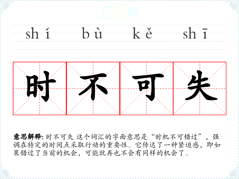 时不可失 这个词汇的字面意思是“时机不可错过”,强调在特定的时间点采取行动的重要性。它传达了一种紧迫感,即如果错过了当前的机会,可能就再也不会有同样的机会了。