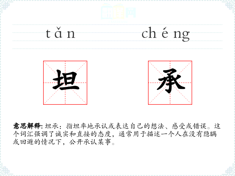 坦承:指坦率地承认或表达自己的想法、感受或错误。这个词汇强调了诚实和直接的态度,通常用于描述一个人在没有隐瞒或回避的情况下,公开承认某事。