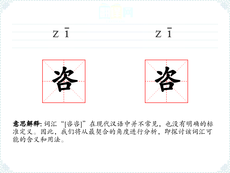 由于“[咨咨]”不是一个标准的汉语词汇,我们无法给出确切的基本定义。它可能是某个方言词汇、古文词汇或者是打字错误。