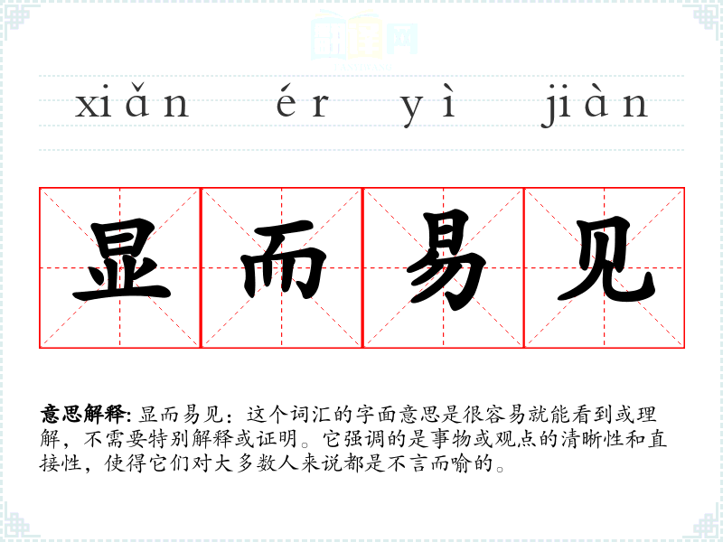 显而易见:这个词汇的字面意思是很容易就能看到或理解,不需要特别解释或证明。它强调的是事物或观点的清晰性和直接性,使得它们对大多数人来说都是不言而喻的。
