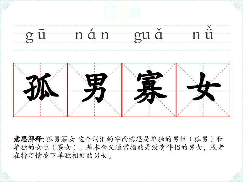 孤男寡女 这个词汇的字面意思是单独的男性(孤男)和单独的女性(寡女)。基本含义通常指的是没有伴侣的男女,或者在特定情境下单独相处的男女。