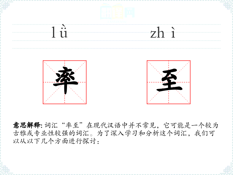 “率”字在古代汉语中有“带领”、“遵循”的意思,“至”则表示“到达”。这两个字组合起来,形成了“率至”这个词汇,表示带领到达的意思。随着语言的发展,这个词汇可能因为使用频率较低而逐渐淡出常用词汇的行列。