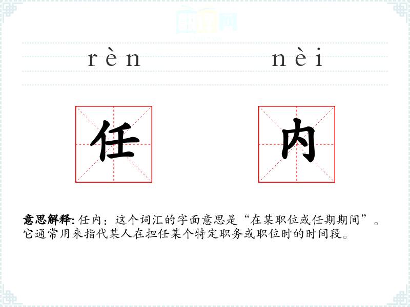 “任内”一词源于汉语,由“任”和“内”两个字组成。在古代汉语中,“任”指职责或职位,“内”指内部或期间。随着时间的推移,这个词汇被广泛用于描述某人在特定职位上的时间。