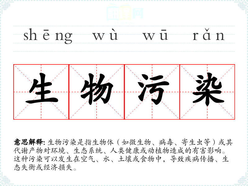 同义词:微生物污染、病原体污染、生态污染 反义词:生物净化、生态平衡、环境卫生