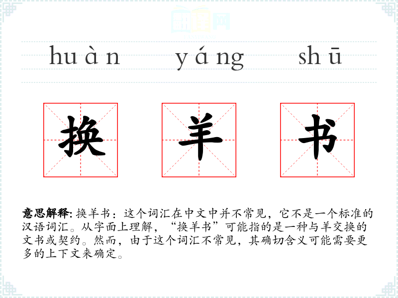 换羊书:这个词汇在中文中并不常见,它不是一个标准的汉语词汇。从字面上理解,“换羊书”可能指的是一种与羊交换的文书或契约。然而,由于这个词汇不常见,其确切含义可能需要更多的上下文来确定。