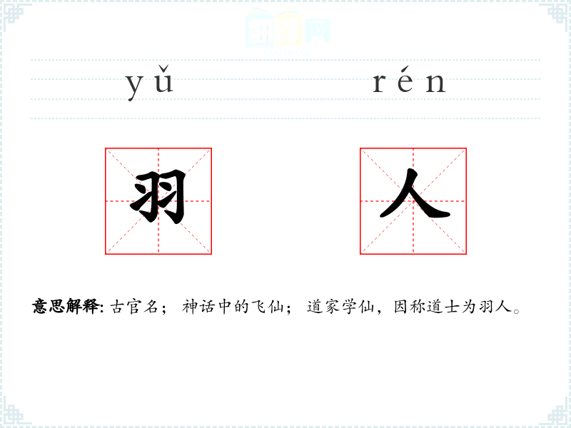 古官名; 神话中的飞仙; 道家学仙,因称道士为羽人。