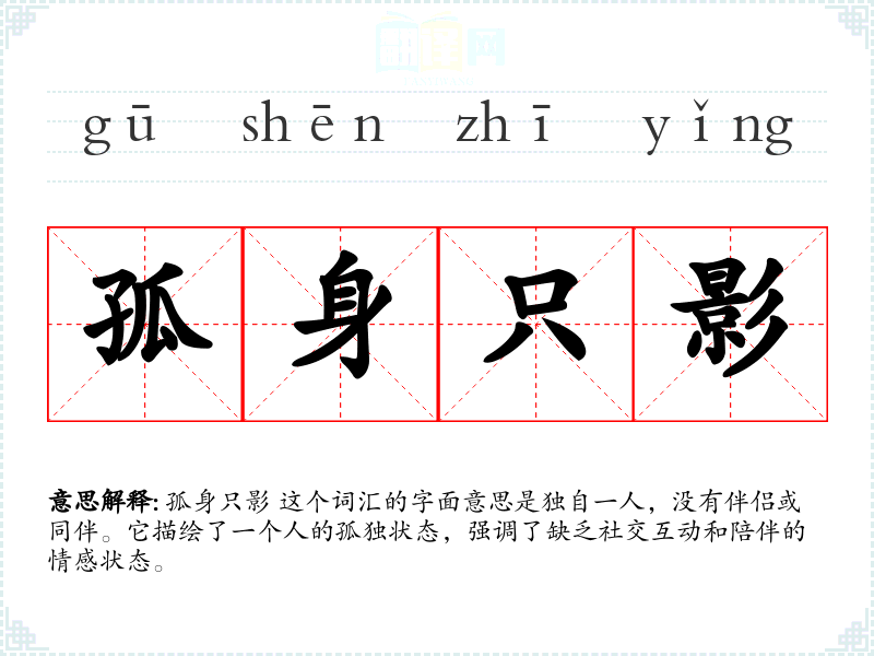 “孤身只影”这个词汇源自汉语,其构成的每个字都有其独立的含义,组合起来则形成了一个描述孤独状态的成语。在古代文学中,这个词汇就已经被广泛使用,随着时间的推移,其含义和用法基本保持稳定。