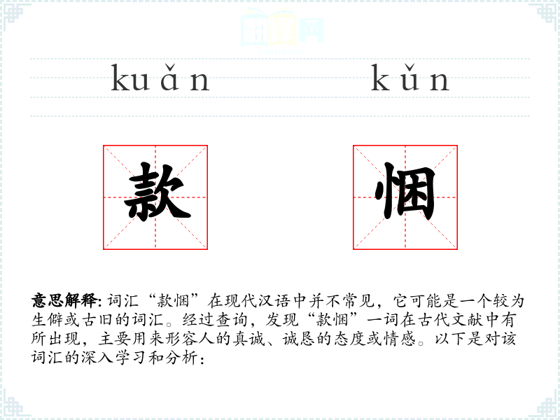 “款悃”是一个富有文化底蕴的词汇,虽然在现代汉语中使用不多,但它体现了汉语的丰富性和历史深度。了解和学习这样的词汇,有助于我们更好地理解和欣赏汉语的多样性和美感。