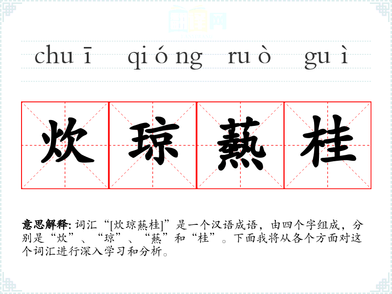 词汇“[炊琼爇桂]”是一个汉语成语,由四个字组成,分别是“炊”、“琼”、“爇”和“桂”。下面我将从各个方面对这个词汇进行深入学*和分析。