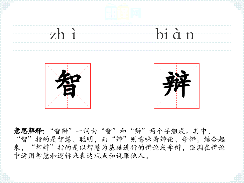 “智辩”一词由“智”和“辩”两个字组成。其中,“智”指的是智慧、聪明,而“辩”则意味着辩论、争辩。结合起来,“智辩”指的是以智慧为基础进行的辩论或争辩,强调在辩论中运用智慧和逻辑来表达观点和说服他人。