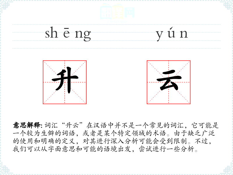 词汇“升云”在汉语中并不是一个常见的词汇,它可能是一个较为生僻的词语,或者是某个特定领域的术语。由于缺乏广泛的使用和明确的定义,对其进行深入分析可能会受到限制。不过,我们可以从字面意思和可能的语境出发,尝试进行一些分析。