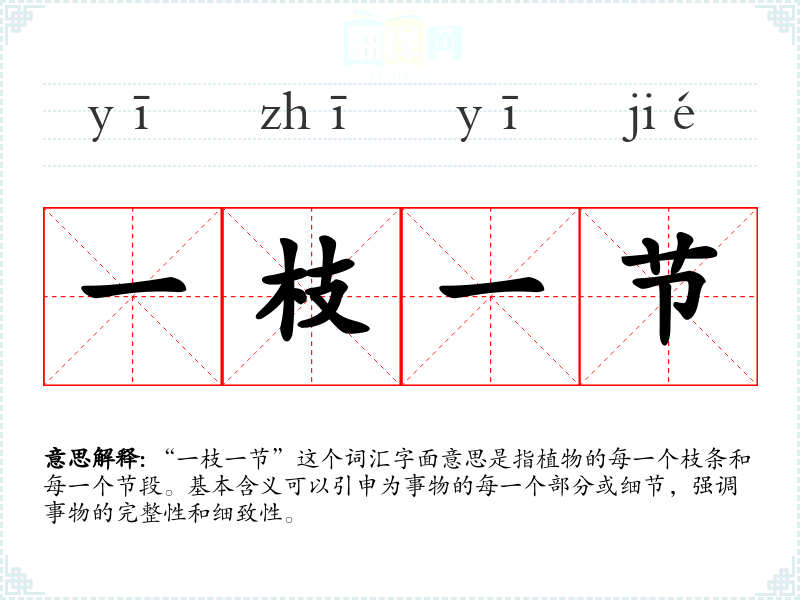 “一枝一节”这个词汇字面意思是指植物的每一个枝条和每一个节段。基本含义可以引申为事物的每一个部分或细节,强调事物的完整性和细致性。