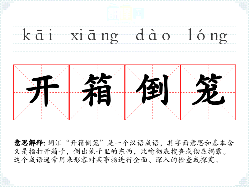 词汇“开箱倒笼”是一个汉语成语,其字面意思和基本含义是指打开箱子,倒出笼子里的东西,比喻彻底搜查或彻底揭露。这个成语通常用来形容对某事物进行全面、深入的检查或探究。
