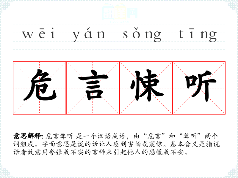 危言耸听 是一个汉语成语,由“危言”和“耸听”两个词组成。字面意思是说的话让人感到害怕或震惊。基本含义是指说话者故意用夸张或不实的言辞来引起他人的恐慌或不安。