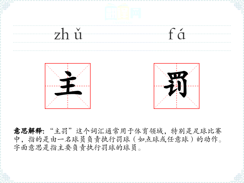 “主罚”一词源于体育术语,随着足球**的发展而逐渐被广泛使用。其词源可能与“主要”和“罚球”两个词汇有关,强调在罚球过程中的主要角色。