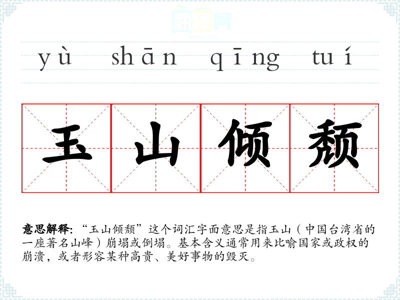 “玉山倾颓”这个词汇字面意思是指玉山(**台湾省的一座著名山峰)崩塌或倒塌。基本含义通常用来比喻国家或政权的崩溃,或者形容某种高贵、美好事物的毁灭。