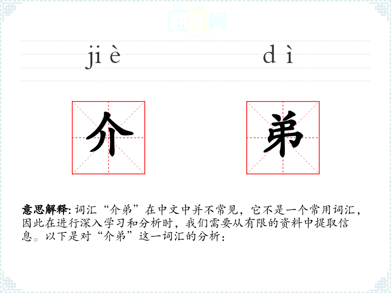 词汇“介弟”在中文中并不常见,它不是一个常用词汇,因此在进行深入学*和分析时,我们需要从有限的资料中提取信息。以下是对“介弟”这一词汇的分析:
