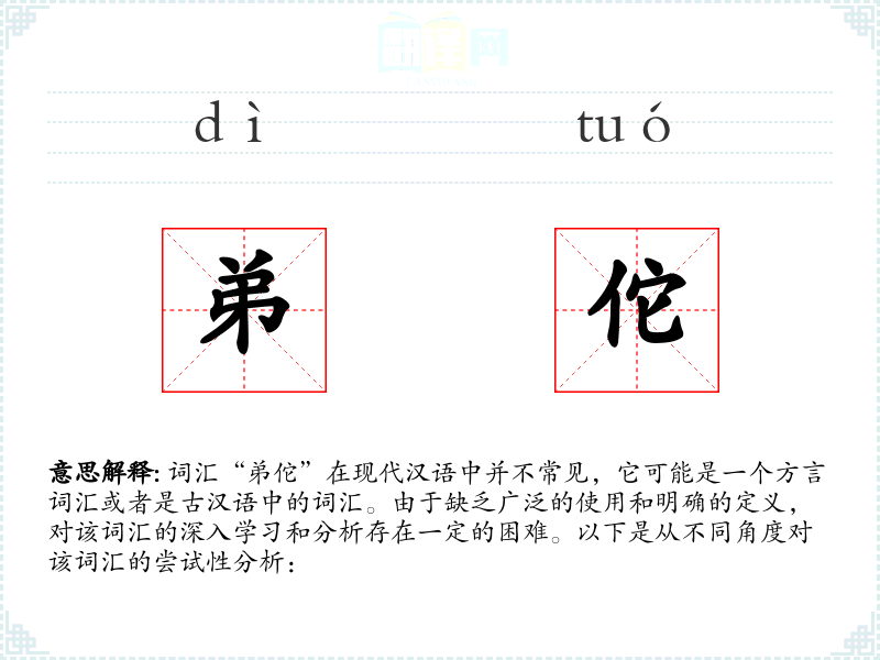 由于“弟佗”不是一个标准汉语词汇,其字面意思和基本含义难以确定。可能需要结合具体的方言或古文语境来解释。