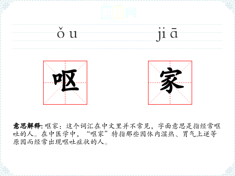 呕家:这个词汇在中文里并不常见,字面意思是指经常呕吐的人。在中医学中,“呕家”特指那些因体内湿热、胃气上逆等原因而经常出现呕吐症状的人。