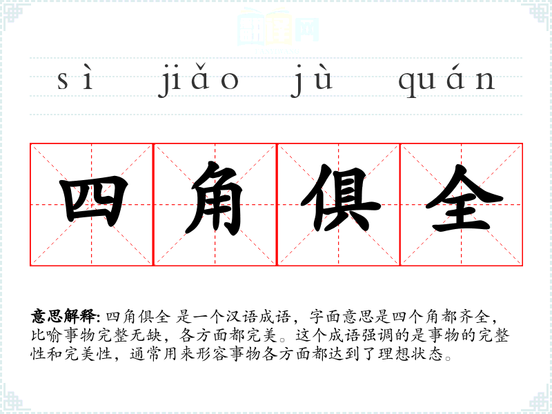 四角俱全 是一个汉语成语,字面意思是四个角都齐全,比喻事物完整无缺,各方面都完美。这个成语强调的是事物的完整性和完美性,通常用来形容事物各方面都达到了理想状态。