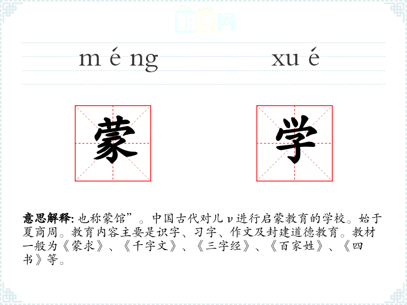 也称蒙馆”。中国古代对儿ν进行启蒙教育的学校。始于夏商周。教育内容主要是识字、习字、作文及封建道德教育。教材一般为《蒙求》、《千字文》、《三字经》、《百家姓》、《四书》等。