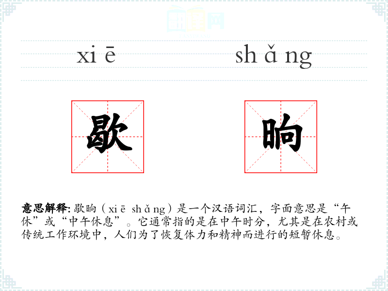 歇晌(xiē shǎng)是一个汉语词汇,字面意思是“午休”或“中午休息”。它通常指的是在中午时分,尤其是在农村或传统工作环境中,人们为了恢复体力和精神而进行的短暂休息。