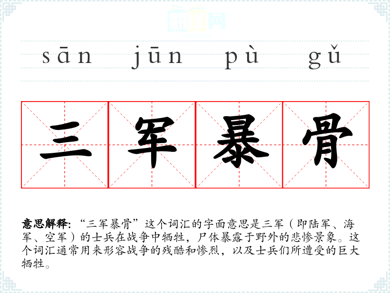 “三军暴骨”这个词汇的字面意思是三军(即陆军、海军、空军)的士兵在战争中牺牲,尸体暴露于野外的悲惨景象。这个词汇通常用来形容战争的残酷和惨烈,以及士兵们所遭受的巨大牺牲。
