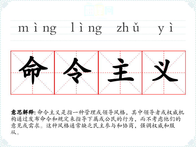 命令主义是指一种管理或领导风格,其中领导者或权威机构通过发布命令和规定来指导下属或公民的行为,而不考虑他们的意见或需求。这种风格通常缺乏民主参与和协商,强调权威和服从。